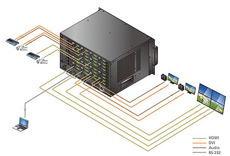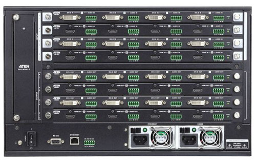 Младшие модели матричных видеопереключателей компании ATEN (VM5404H/5808H) прекрасно могут выполнять свои функции, решая повседневные задачи в малом и среднем бизнесе, а также могут являться элементами большой распределенной системы видеотрансляции на крупном предприятии. Но в линейке матричных видеопереключателей ATEN есть старшая модель, которая одна может заменить собой, множество различных устройств, необходимых для создания и управления сети видеотрансляции.