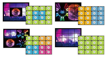 Поскольку VM1600 является старшей моделью в линейке матричных коммутаторов ATEN, то он, как и младшие модели, имеет возможность формировать единые пространства отображения — видеостены. Причем размерность и количество, одновременно поддерживаемых видеостен, в VM1600 заметно увеличились. Например, возможна одновременная организация 4-х видеостен размером 2х2 экрана, что является довольно частым решением во всякого рода развлекательных заведениях. Так же, например, можно сделать одну большую стену 4х4 экрана в крупном диспетчерском центре или стену размером 8х2 для Art-инсталляции. С увеличением числа портов до 16-ти вариантов использования коммутатора стало намного больше, что в свою очередь сильно расширило возможные области его применения.