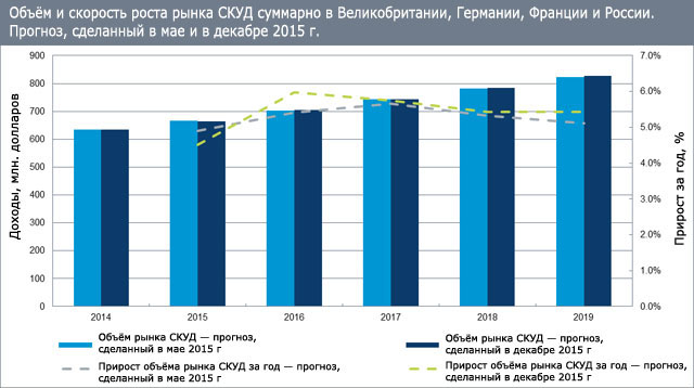 Значительной коррекции подвергся прогноз по Франции — скорость ежегодного роста рынка СКУД между 2015 и 2019 годами ожидается здесь на уровне 5.0%, а не 3.9%, как предполагалось ранее. В России этот показатель поправлен в другую сторону — с 2.6 до 0.3%. Взгляды на будущее рынков Германии и Великобритании не изменились.