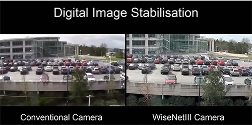 Необходимость стабилизировать изображение возникает в тех системах видеонаблюдения, в которых камеры подвержены механическому воздействию извне. Решая эту задачу, компания Hanwha Techwin разработала технологию «Цифровая стабилизация изображения» (Didital Image Stabilization — DIS). Она обеспечивает программную обработку изображения, компенсирующую дрожание телекамеры. Эта технология используется, в частности, в новых IP-камерах линеек Wisenet Q и Wisenet P.
