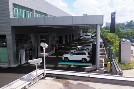 Система видеонаблюдения контролирует периферийные участки, въезды и выезды, ключевые пересечения маршрутов и автопарковку. На въездах и выездах из автосалона поток машин достаточно плотный, а кроме того, условия освещенности там непостоянны из-за смены погоды и времени суток. Эти факторы представляют собой определенную проблему для камер системы видеонаблюдения, так как при таких условиях сложно получить качественное изображение проезжающих автомобилей. Для этого уличные камеры должны уметь эффективно работать при различных погодных условиях. С учетом этих требований были рекомендованы IP-камеры AXIS P1354.