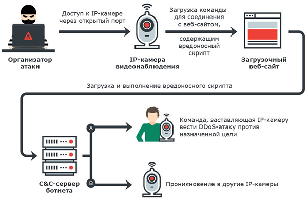 Все камеры, входящие в состав ботнета, в некоторый момент могут вместе провести DDoS-атаку против Интернет-ресурса, который станет их целью. Под воздействием такой атаки этот ресурс перегрузится запросами извне и перестанет работать. Помимо участия в DDos-атаке, заражённая IP-камера может заниматься поиском в Интернете других уязвимых камер.