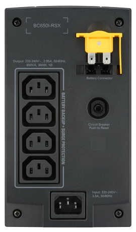 Резервный ИБП APC Back-UPS BC650I-RSX предназначен для защиты компьютеров, периферийного и сетевого оборудования, а также проекторов с импульсной мощностью, игровых консолей и сетевых хранилищ (NAS) от сбоев электропитания. Его мощность составляет 360 Ватт (650ВА), в устройстве предусмотрен разъем для подключения внутренней батареи и установлен многоразовый автоматический предохранитель. Четыре компьютерные сетевые розетки (IEC 320 C13) с защитой от всплесков напряжения и резервным питанием от батареи размещены на задней панели корпуса. В комплект поставки входит ИБП, кабель для подключения к сети переменного тока и два кабеля для подключения оборудования.