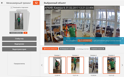 - Межкамерный трекинг стал ещё точнее, благодаря кнопке «Уточнить результаты». Можно выбрать хотя бы один похожий фрагмент и уточнить результаты поиска. На экран будут выведены новые результаты с учетом уже выбранных фрагментов. Уточнение поиска можно выполнять несколько раз — после выбора очередного совпадения.
