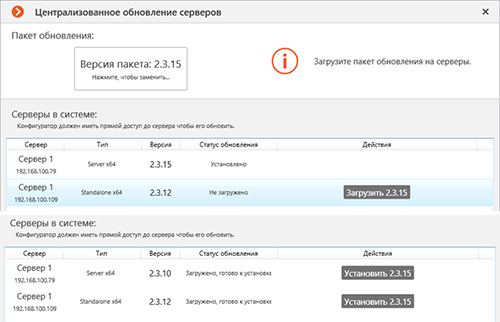 - Централизованное обновление серверов. Необходимо 1 раз скачать обновление и с одного рабочего места, даже удалённого, можно обновить все сервера в системе, также откатить обновления до предыдущей версии.