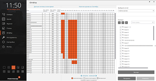 - Появился отчёт о глубине архива. С версии 2.3 пользователь системы может построить отчёт, который покажет наличие записей в архиве в определённый день по конкретной камере. Данная функция поможет определить неполадки с камерами или сетью.