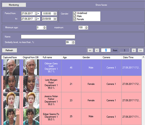 - В интерфейс распознавания и поиска лиц добавлен фильтр по степени сходства. При включенном фильтре не отображаются распознанные лица, имеющие процент сходства с эталоном ниже заданного порога.
