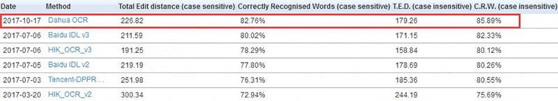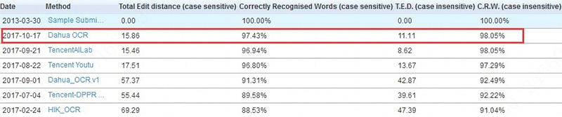 Согласно информации, опубликованной на сайте ICDAR Robust Reading 2015 в октябре 2017 года, компания Dahua Technology заняла первое место в конкурсе [Word Recognition] в категориях распознания случайного текста (Incidental Scene Text Challenge) и распознания текста с цифровых изображений (Born-Digital Image Challenge), добившись точности 82.76 % и 97.43 % соответственно.