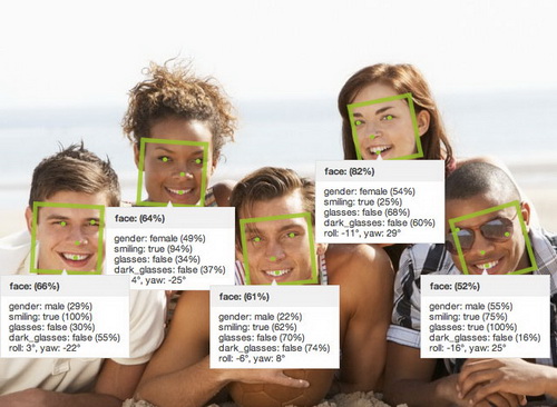 Например, функция faces/detect получает в качестве аргументов URL изображений, список возвращаемых полей и степень отношения скорости к точности детектирования. А структура данных, которую она возвращает, содержит координаты лиц, координаты глаз, информацию о степени поворота лица к плоскости съемки, предполагаемый пол человека, вероятность наличия на фотографии очков или черных очков и даже информацию о том, улыбается ли человек. Немало данных для программиста, не правда ли?
