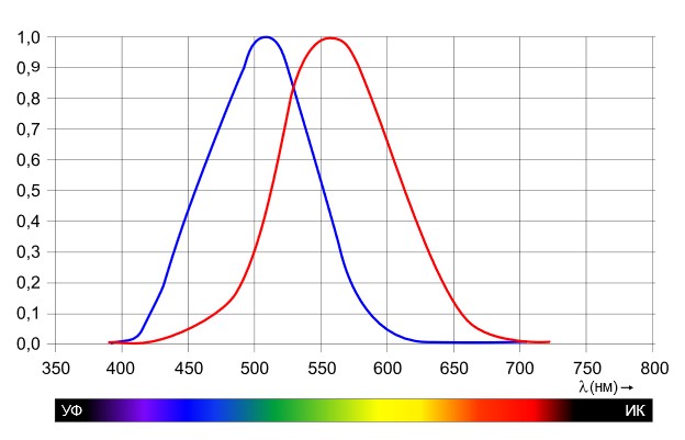 Относительная спектральная световая эффективность для дневного (красная линия) и ночного (синяя линия) зрения