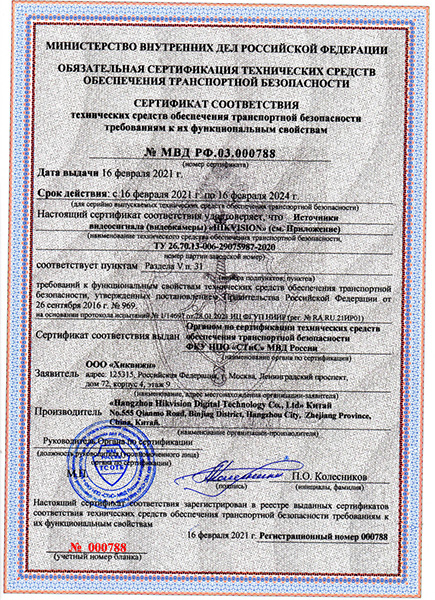 Испытания проходили в лаборатории ФГУП «Российский научно-исследовательский институт радио им. М.И.Кривошеева». Сертификат соответствия выдан ФКУ НПО «СТиС» МВД России, уполномоченным органом по сертификации технических средств обеспечения транспортной безопасности. Документ подтверждает, что устройства Hikvision полностью соответствуют требованиям действующего законодательства и могут без ограничений применяться для обеспечения безопасности на объектах транспорта и транспортной инфраструктуры.