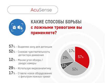 Причин, почему срабатывает ложная тревога, достаточно много. Из них самые распространенные – неправильная установка камер видеонаблюдения и неправильная настройка функций. Существует большое количество способов борьбы с нерелевантными тревогами – их выбор зависит непосредственно от первопричины некорректной работы системы. Как показал опрос специалистов рынка безопасности, в большинстве случаев достаточно изменить положение камеры или произвести нужные настройки, чтобы сократить количество ложных тревог. Например, 57 % респондентов ответили, что пользуются функцией выделения области (зоны) мониторинга, чтобы тревоги срабатывали только при появлении объектов на данной территории. В 52 % случаев пользователи снижают уровень чувствительности детектора движения, что может сработать, но при этом есть вероятность упустить значимое происшествие. Еще 12 % опрошенных ответили, что справляются с проблемой ложных тревог путем изменения угла обзора/ракурса камеры – такой способ действительно может помочь в тех случаях, когда рядом с охраняемой территорией есть участки с высокой активностью (движение автомобилей, людей), однако он применим далеко не всегда. Поэтому, когда более простые методы не справляются или не подходят, пользователи начинают применять видеоаналитику (29 % респондентов) для детекции нужных им объектов или событий. Еще в 17 % случаев клиенты производят полную замену оборудования на новые устройства с поддержкой классификации объектов и специальных фильтров ложных тревог, например камеры и регистраторы с технологией AcuSense.