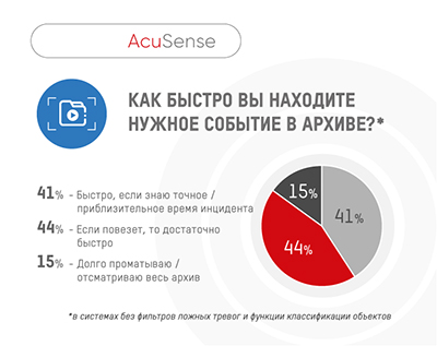 Каждый из этих способов отличается разным уровнем эффективности, что в конечном счете влияет на скорость поиска события в архиве и реагирования. Если говорить о системах без специальной аналитики, то 41 % респондентов признались, что могут быстро найти нужный фрагмент записи только тогда, когда знают точное или хотя бы примерное время инцидента. Чуть большее количество пользователей (44 %) полагаются на «фактор везения» и на то, что нужная запись найдется быстро. В 15 % случаев оператору приходится отсматривать/проматывать весь записанный архив, чтобы найти искомый фрагмент. Подобные ответы также показали, что пользователи постоянно сталкиваются с проблемой нерационального использования времени на поиск и необходимостью оптимизации работы с хранилищем, которое «забивается» ненужными записями.