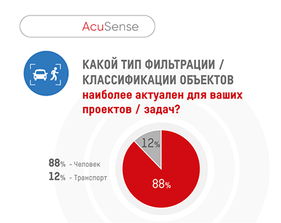 Самый распространенный тип фильтра ложных тревог – это классификация объектов. Обычно пользователей интересует два типа объектов, при появлении которых система должна сгенерировать тревожный сигнал: человек и транспорт. При этом первый вариант фильтрации наиболее актуален для пользователей (88 % респондентов), тогда как выборка фрагментов архива, где присутствует транспорт, является скорее специализированным решением, чем массовым – за этот вариант проголосовали всего 12 % участников.