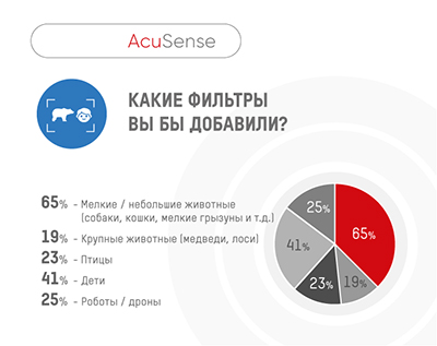 Интересен тот факт, что с развитием видеоаналитики на базе алгоритмов глубокого обучения пользователи систем безопасности начинают интересоваться и другими типами классификации объектов, по которым они бы хотели настраивать срабатывание уведомлений. Например, 65 % респондентов заинтересованы в целенаправленной детекции небольших и мелких животных (собаки, кошки, мелкие грызуны и т.д.). Для 23 % интересна детекция птиц, а для 19 % - крупных животных (например, медведей, лосей и других). Немалое количество пользователей (41 %) хотят не просто находить в архиве записи с участием человека, но фиксировать события с участием детей и, соответственно, своевременно получать тревожные сигналы при их приближении к опасным для них зонам. Четверть участников опроса (25 %) проявила интерес к детекции дронов и роботов в кадре.