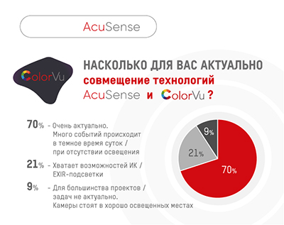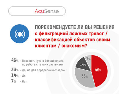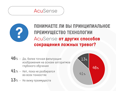 На примере технологии AcuSense, 46 % респондентов ответили, что знают и понимают ее отличие от других вышеперечисленных способов сокращения ложных тревог. Чуть меньшее количество пользователей (41 %) признались, что еще не разобрались до конца в сути разработки. Еще 13 % не увидели для себя преимуществ в новых решениях для классификации объектов и фильтрации ложных срабатываний в системах безопасности.