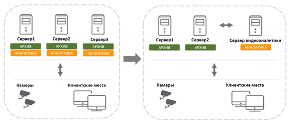 Основные серверы делегируют интеллектуальную обработку видео (в соответствии с подключенными модулями) и детекцию движения на сервер видеоаналитики. Это не повышает суммарную вычислительную нагрузку системы, но делает ее работу более стабильной и надежной. Основные серверы при этом занимаются записью видео в архив.