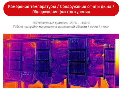 Динамический модуль тепловизора 160-й серии позволяет оперативно фиксировать повышение температуры и возникновение пожароопасной ситуации на самых ранних стадиях, еще до появления видимого пламени. При детекции температурных аномалий срабатывает тревожная светозвуковая сигнализация, оператор системы получает сигнал в режиме реального времени. Гибкие настройки программного обеспечения позволяют контролировать состояние конкретной точки, линии и выделенной области.