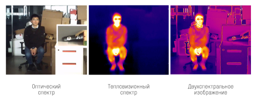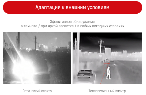 Функция совмещения двух спектров используется для более точного определения событий и объектов. Увеличенное разрешение оптического модуля (4 Мп) обеспечивает детализацию кадра, что позволяет быстро выявить источник тревоги и принять необходимые меры. Оптическое и тепловизионное изображение можно просматривать как по отдельности, так и в формате наложения кадров («картинка-в-картинке»). Тепловизионный спектр особенно эффективен для охранного мониторинга в темное время суток или в плохих погодных условиях (туман, осадки), а также в тех случаях, когда обзор перекрывают деревья, кусты и т.д.
