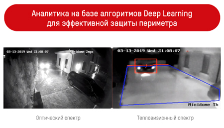 Видеоаналитика на базе алгоритмов глубокого обучения позволяет фильтровать ложные тревоги, вызванные нерелевантными событиями и объектами (движение небольших животных, осадки и т.д.). Двухспектральные тепловизоры с помощью нейросетевой аналитики классифицируют объекты по типу «человек» и «транспортное средство». Функция защиты периметра срабатывает на расстоянии до 70 метров.