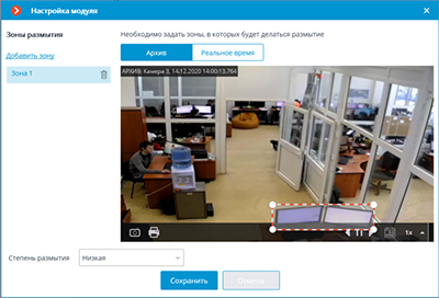Для того, чтобы скрыть детали видеоизображения, оператор Macroscop 3.3 может использовать модуль размытия областей кадра. Модуль уменьшает разрешение отдельных областей кадра при просмотре видео в клиенте в реальном времени. В архиве размытие работает только на стоп-кадре, при воспроизведении и экспорте