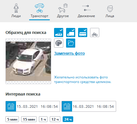 Для любого поиска можно выбрать временной интервал (из меню: 5 мин, 10 мин, 1 ч, 12 ч, 24 ч,- или задать вручную), камеры, область кадра, а также задать направление пересечения виртуальной линии.