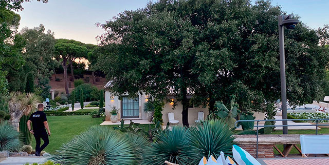Вилла, занимающая 2 гектара, патрулируется службой безопасности клиента, наличие которой он считает необходимым. Этот финансово благополучный район постоянно привлекает внимание злоумышленников, и грабежи здесь происходят регулярно.
