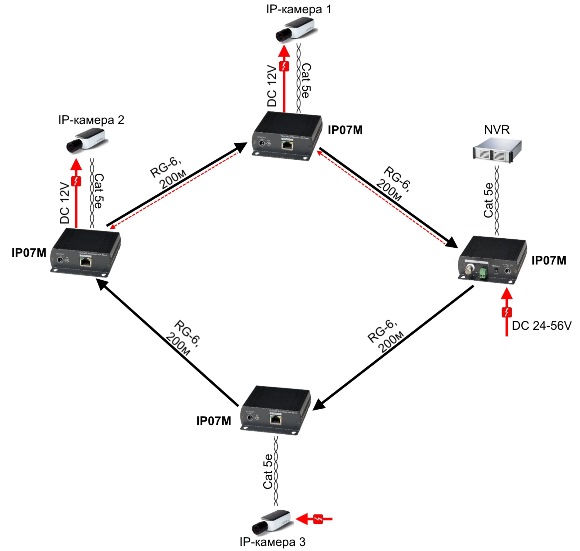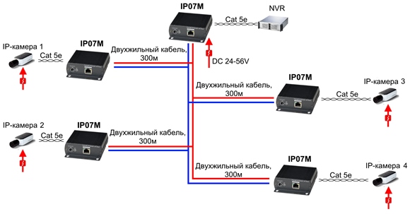 В данной схеме питание подаётся только на один IP07M – остальные питаются от линии (расстояние между любыми двумя устройствами IP07M не должно превышать 300м).