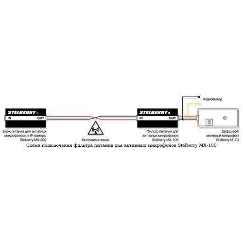 Для исключения воздействия помех на качество звука активного микрофона, необходимо подключить фильтр питания STELBERRY MX-100 в разрыв линии питания, расположив его рядом с микрофоном для видеонаблюдения.