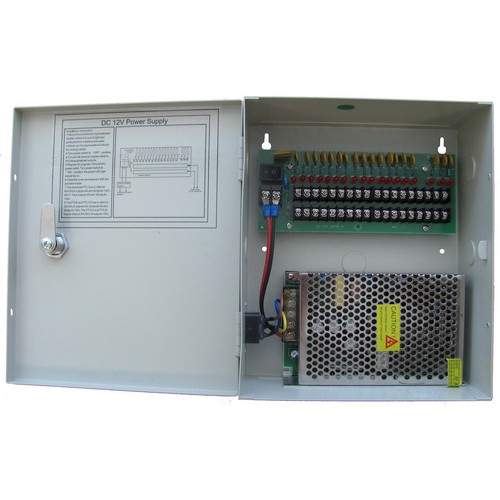 Источник питания импульсный стабилизированный, 12V DC/ 10А. 18 выходов по 0.5А; каждый выход имеет индивидуальный самовосстанавливающийся предохранитель и светодиод состояния работы; защита от короткого замыкания, высокого напряжения, повышенной нагрузки; входное напряжение 90-264V AC (50/60Hz), металлический корпус, 210x240x65 мм.