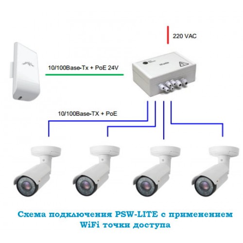 Главной особенностью коммутатора для уличного видеонаблюдения TFortis PSW-LITE является поддержка пятым портом Passive PoE 24V, что позволяет подключать беспроводные точки доступа типа UBIQUITI без использования внешних адаптеров питания и переходников PoE.