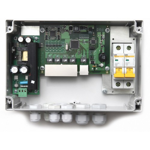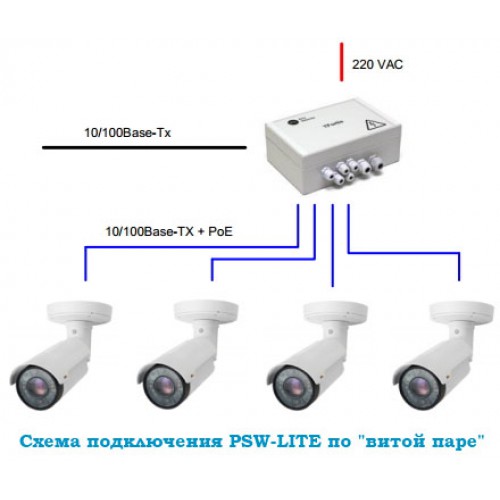 PSW-LITE это уличный 5-портовый неуправляемый коммутатор для построения систем уличного IP-видеонаблюдения. Имеет 4 порта 10/100Base-Tx с PoE IEEE802.3af (пары 4, 5 и 7, 8) – 15.4 Вт на порт, предназначенные для подключения IP-камер. И 1 порт 10/100Base-Tx с поддержкой Passive PoE 24V (пары 4,5 и 7,8) – 24В, 0.5А. Внутри коммутатора имеется DIN-рейка для установки автоматов.
