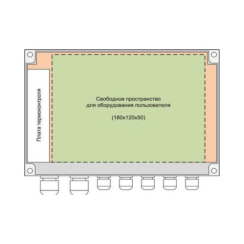 Устройство T-BOX представляет собой всепогодный герметичный бокс с габаритами размерами 240х160х90 мм. Все подключения осуществляются через кабельные вводы, не нарушая герметичности блока. Внутри устройства располагается плата термоконтроля и радиатор. Свободное пространство для оборудования пользователя составляет 180х120х50 мм или 180х120х63 мм с учетом верхней крышки.