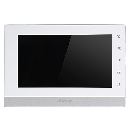 TFT сенсорный емкостной дисплей 7", подключение до 20 вызывных панелей и просмотр до 8 камер, слот для MicroSD карт памяти (до 32ГБ), накладной тип монтажа, цвет корпуса белый с серебристой вставкой, 1x RJ45 Ethernet 100Мбит/с, 12V DC (7 Вт), 0.8 кг, 200x126x22 мм, -10…+55° C.