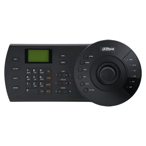 Интерфейсы подключения: RS-485, RS-422, USB, RS-232, RJ-45. Поддерживаемые протоколы: DH-SD, PELCO-P, PELCO-D и др. 3-осевой джойстик, LCD-дисплей, 330x160x38 мм, 2.5 кг, 12V DC (5 Вт), -10...+55° C.
