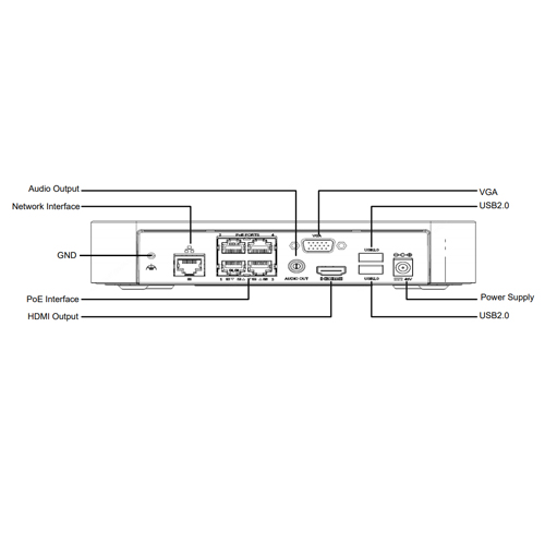 Сетевой видеорегистратор, 4-канальный (до 5MP), пропускная способность до 40 Mбит/c, Ultra 265/ H.265/ H.264. Аудио вых. 1x RCA, вых. на монитор (1х HDMI / 1х VGA), разрешение и скорость записи: 5MP (2592x1920) - 30 кадр/с на канал, 4MP (2560x1440) - 25 кадр/с на канал, 3MP (2048x1536) - 30 кадр/с на канал, 1080P (1920x1080) - 25 кадр/с на канал, 720P/ D1/ 2CIF/ CIF - 30 кадр/с на канал; ONVIF, жесткий диск (1x HDD SATA до 10 Тб), поддержка видеоаналитики камер, 2x USB 2.0, 4 порта PoE, 1x RJ45 Ethernet 100Мбит/с, 48V DC (10 Вт), 0.6 кг, 205x205x46 мм, -10°...+55° C.