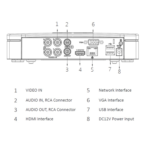 HD видеорегистратор гибридный, 4-канальный (пентабридный: HDCVI, IP, аналог, AHD, TVI) + 2 канала IP (до 5MP), пропускная способность до 24 Mбит/c, H.264+/ H.264. Вх. 4x BNC, аудио вх. 1x RCA / вых. 1x RCA, вых. на монитор (1х HDMI / 1х VGA), разрешение и скорость записи: Full HD 1080P (1920x1080)/ 4M-N - 15 кадр/с на канал, HD 720P (1280x720) - 25 кадр/с на канал, 1080N/ 960H/ D1/ HD1/ BCIF/ CIF/ QCIF - 25 кадр/с на канал; жесткий диск (1x HDD SATA до 8 Тб), 2x USB 2.0, 1x RJ45 Ethernet 100Мбит/с, 12V DC / 2A (10 Вт), 0.6 кг, 205x211x45 мм.