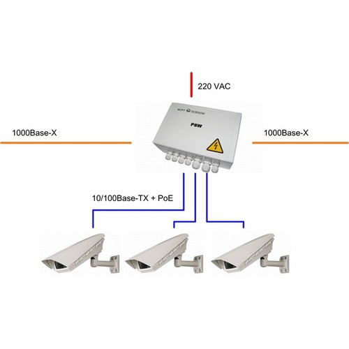 Устройство имеет 3 порта для подключения видеокамер. Эти порты оборудованы PoE-инжектором, что позволяет удаленно запитать как видеокамеру, так и термокожух по обычной 4-х парной витой паре. Передача данных, питание видеокамеры и термокожуха – все пойдет через один кабель. Вам уже не придется прокладывать дополнительно кабель питания до видеокамеры. Это позволит Вам сэкономить на материалах и работах. И если даже в местах установки видеокамер будет по близости питание, то могут возникнуть проблемы с легализацией по его использованию (нужно ставить счетчик, проводить согласования и т.д.). Используя PSW-2G, Вы уходите от вышеуказанных проблем и затрат. С PSW-2G Вы будете устанавливать видеокамеры там, где их нужно ставить, а не там, где получается.