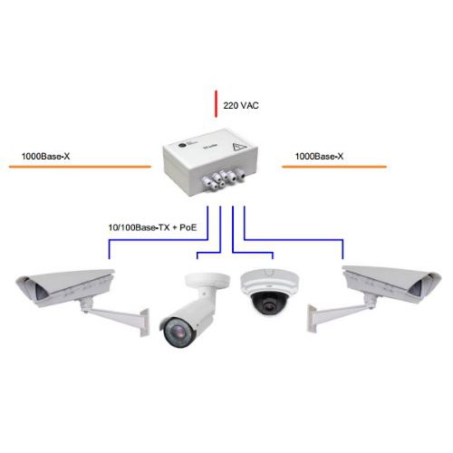 При работе с термокожухами TFortis TH коммутатор по обычной витой паре питает и видеокамеру (IEEE802.3af) и термокожух (Passive PoE).