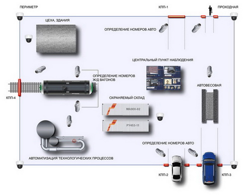 Итак, можно выделить три основные задачи обеспечения безопасности промышленного предприятия - (1) мониторинг охраняемого периметра предприятия и ситуации на объекте, (2) контроль автотранспортных средств на КПП и территории предприятия, и (3) контроль грузов, доставляемых по железной дороге.
